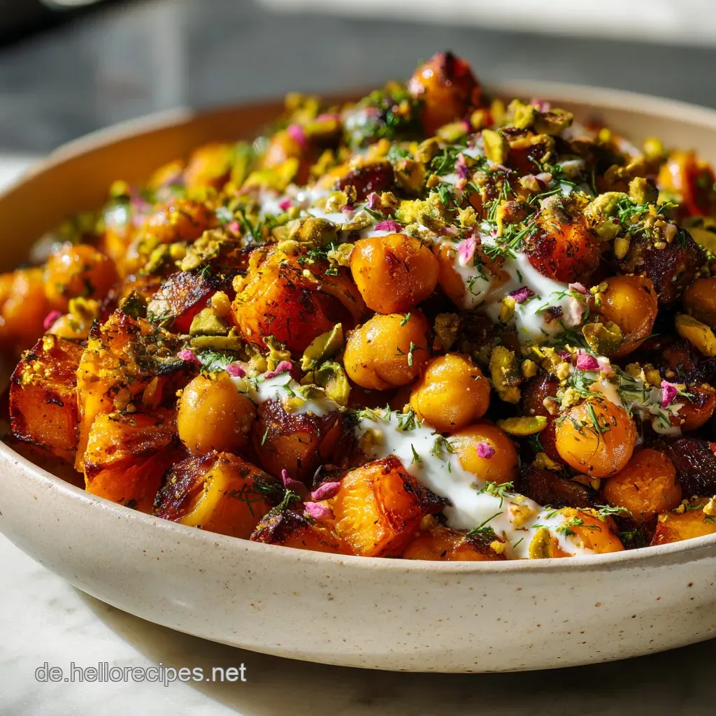 Um dieses Gericht vegan zuzubereiten, ersetzen Sie einfach den Joghurt durch eine pflanzliche Alternative, beispielsweise ungesüßten Soja-, Kokos- oder Mandeljoghurt. Alle anderen Zutaten wie der Kürbis, die Kichererbsen, Datteln und Pistazien sind von Natur aus pflanzlich und müssen nicht ersetzt werden.