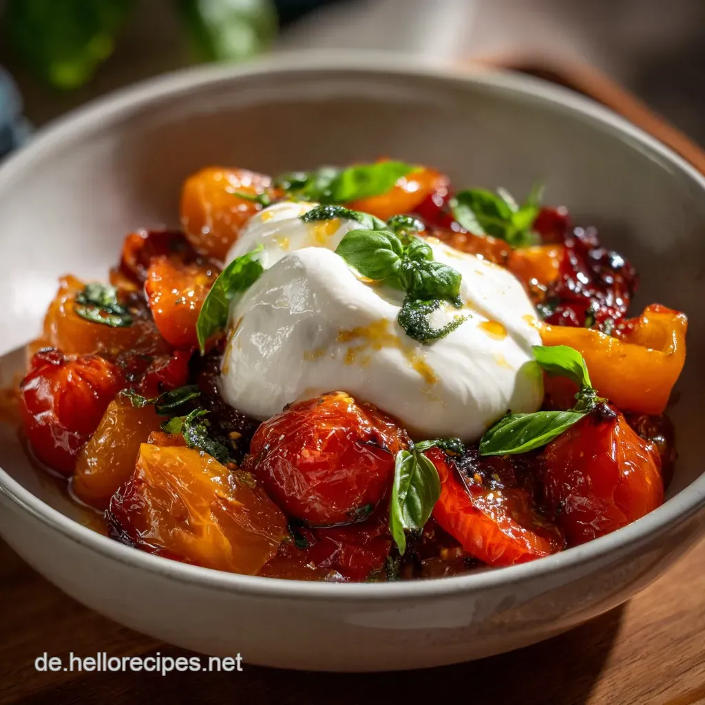 Hey du, pass auf. Wenn der Duft von karamellisierten Tomaten und süßer Paprika aus dem Ofen strömt, dann weißt du: Das Leben ist gut. Dieses Gericht, die Geröstete Tomaten Paprika Burrata , ist nicht nur eine Mahlzeit, es ist ein Erlebnis.