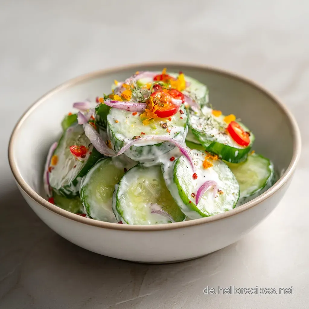 In Süddeutschland wird der Salat oft mit einer ordentlichen Portion Zwiebeln serviert. Die Schärfe der Zwiebel bildet einen tollen Kontrast zum milden Joghurt. Im Norden hingegen findet man oft Varianten mit einem Schuss Sahne oder sogar ein wenig Senf im Dressing, was dem Ganzen eine würzige Tiefe verleiht.