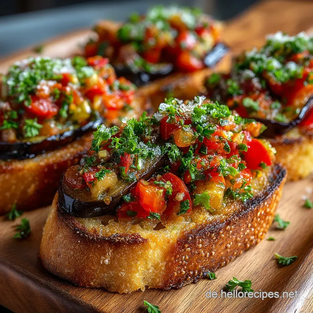 Die Temperatur ist entscheidend: Dieses Auberginen Bruschetta schmeckt am besten, wenn die Auberginen lauwarm sind. Achten Sie darauf, den frischen Basilikum erst in der letzten Minute unter das Topping zu mischen. Er behält so seine leuchtend grüne Farbe und sein knackiges Aroma. Ein finaler Hauch von hochwertigem Olivenöl direkt über dem Topping verstärkt die mediterranen Noten und sorgt für den perfekten Glanz.