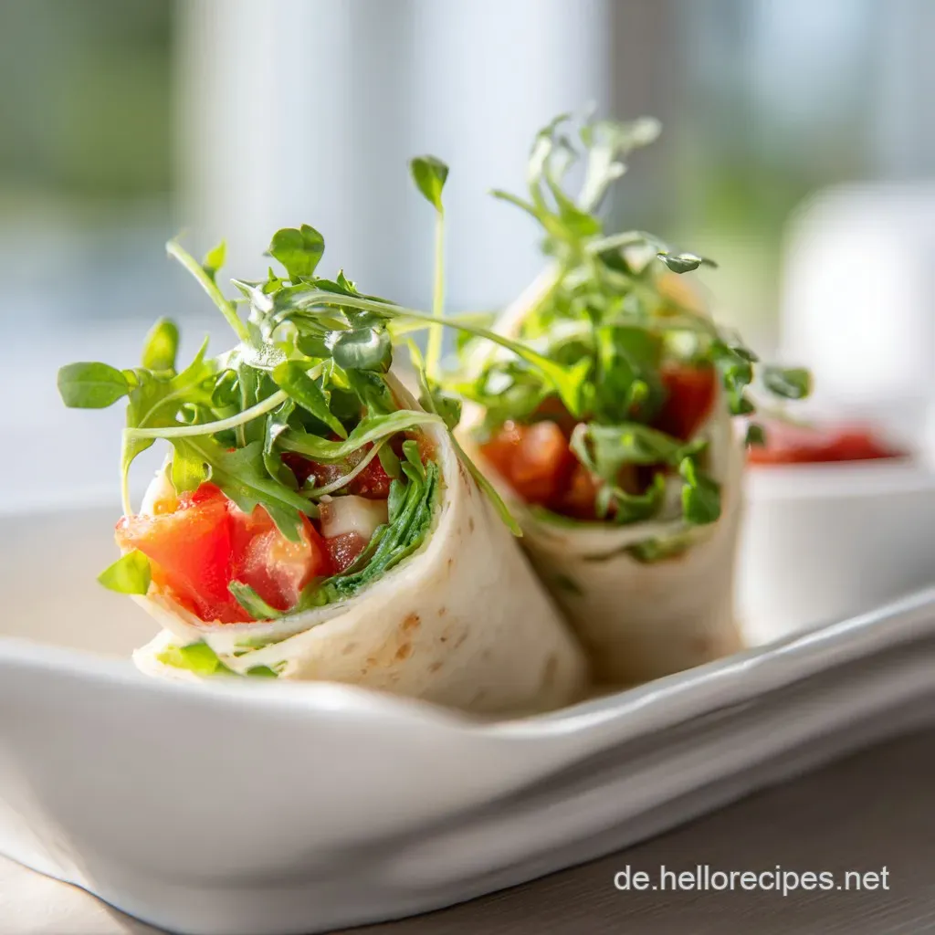 Das Auge isst mit, besonders bei Fingerfood. Platziere die vegetarische Wrap Röllchen auf einer dunklen Schieferplatte oder einem Holzbrett, damit die grünen Akzente des Rucola und das Rot der Tomaten richtig leuchten.